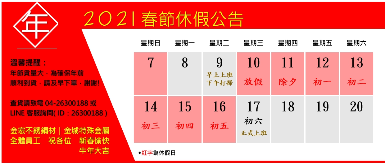 2021春節休假公告 ※2/9號上午為最後出貨日及最後自取日期,下午將進行打掃作業 ※2/10~2/16為春節休假期間,客服出貨等作業暫停服務 ※2/17將開始陸續為大家處理訂單,還請大家耐心等候 感謝大家過去一年來的支持 希望新的一年可以再為大家服務 金宏|金城 全體員工祝大家 新年快樂 牛年大吉